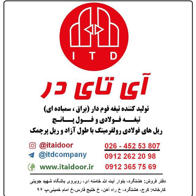 شرکت آی تای در ✔️تيغه کرکره برقي فوم دار (سمباده ای و براق ، استاتیک و طرح چوب ) ✔️تیغه فولادی ساده ( تک جداره ) ✔️تیغه فولادي فول پانچ ( تیغه شفاف ضدسرقت ) 🔻تلگرام : t.me/itdcompany 🔻اینستاگرام : www.instagram.com/itaidoor Support@itaidoor.ir🔻 تماشا: https://tamasha.com/itaidoor آپارات: https://www.aparat.com/itaidoor 📞02645253807 09123657569 09122622098 مدیریت:صفری